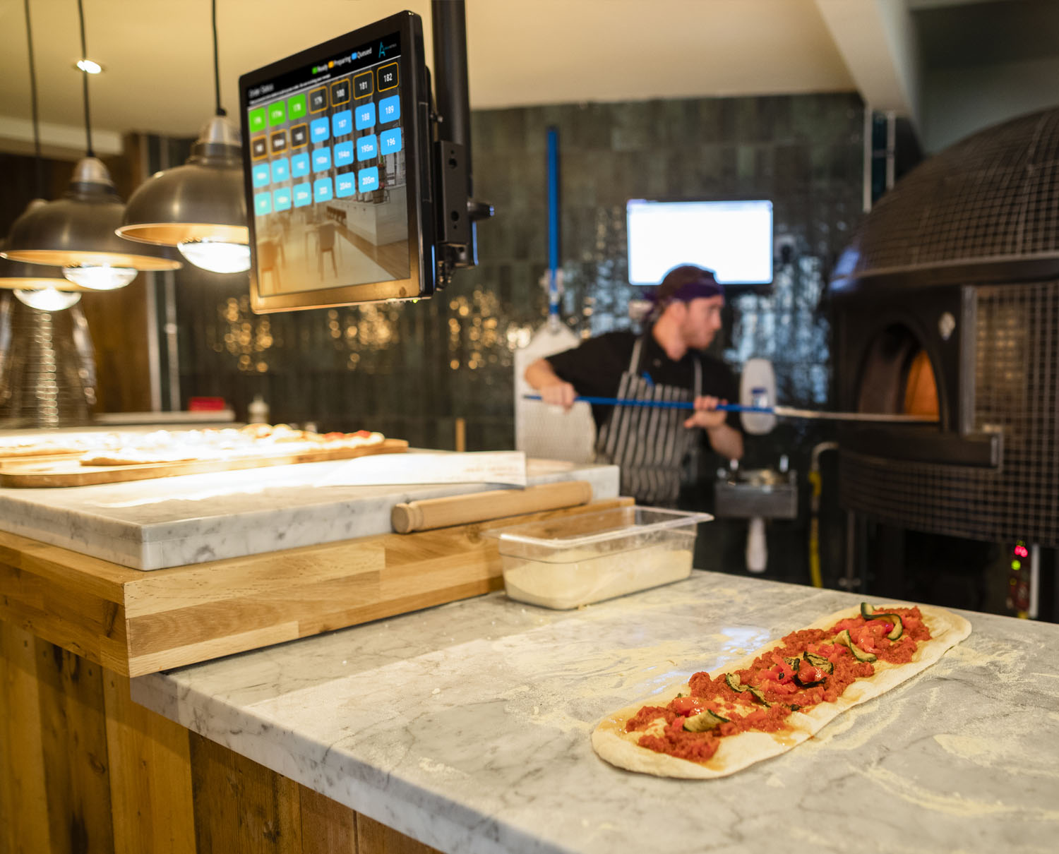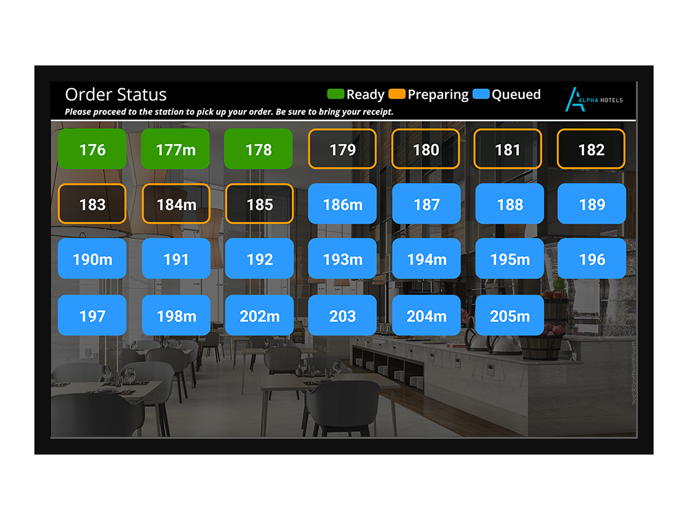 お客様向けの注文ステータス ディスプレイには注文番号ごとにステータスが表示され、お客様への通知プロセスが自動化されます。お客様にとっては簡単で、スタッフにとっては時間の節約になります。 シェフが注文を伝えると、準備ができたと表示され、お客様が料理を受け取ります。