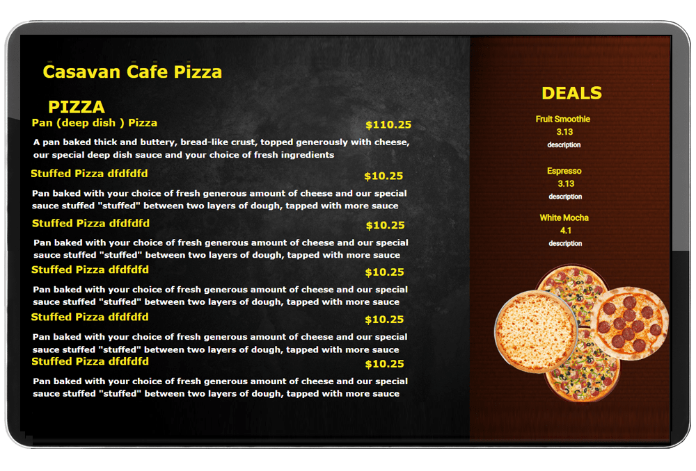 F&B ソリューションのご紹介デジタル メニュー ボードを使用すると、ユーザーは定義済みテンプレートを使用してレイアウトを作成および設計し、指定したメニュー リストに対して定義された時間に自動更新されるメニューをスケジュールできます。また、アイテムやコンボのプロモーション価格を含むローテーション メニューにも対応しています。
